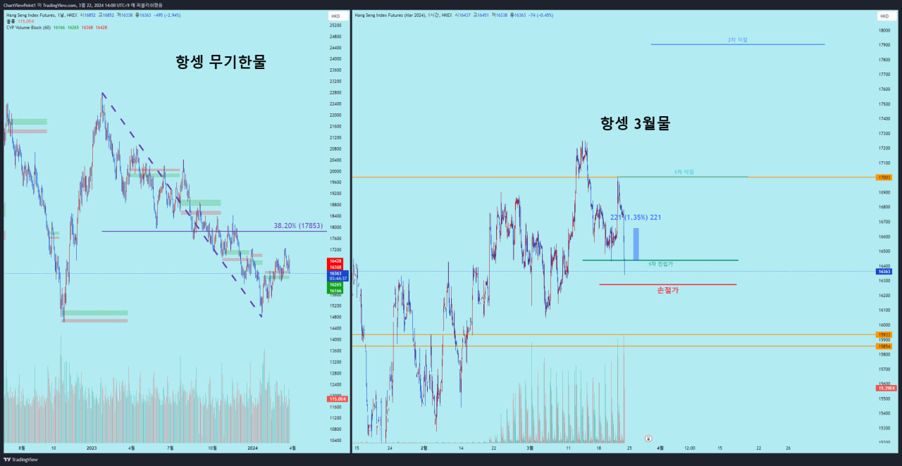 때문에 이번 항셍 매수 공략은 매물대에서 추세가 깨지지 않는 범위에서 손익비를 좋게 손절을 짧게 가져가는 공략으로 남은 목표가인 2차 매수 목표가격인 17830을 노리고 매수공략을 세웠습니다.
